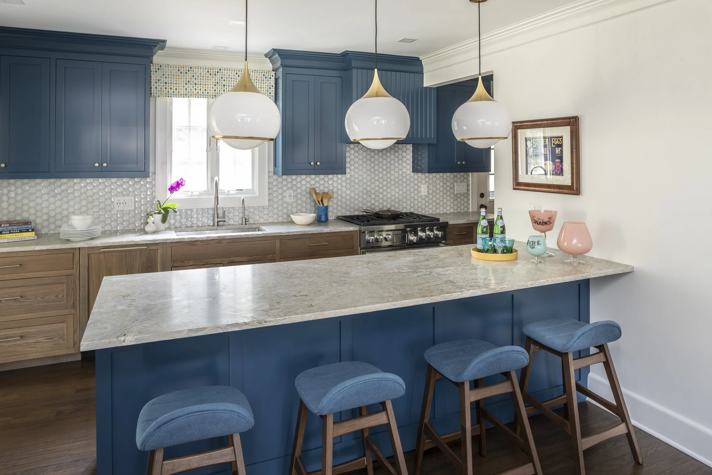 Modern kitchen with blue cabinets, white subway tile backsplash, and a large island with blue paneling. Three pendant lights hang over the island, which has a light-colored marble countertop. The kitchen has a window above the sink, small decorative