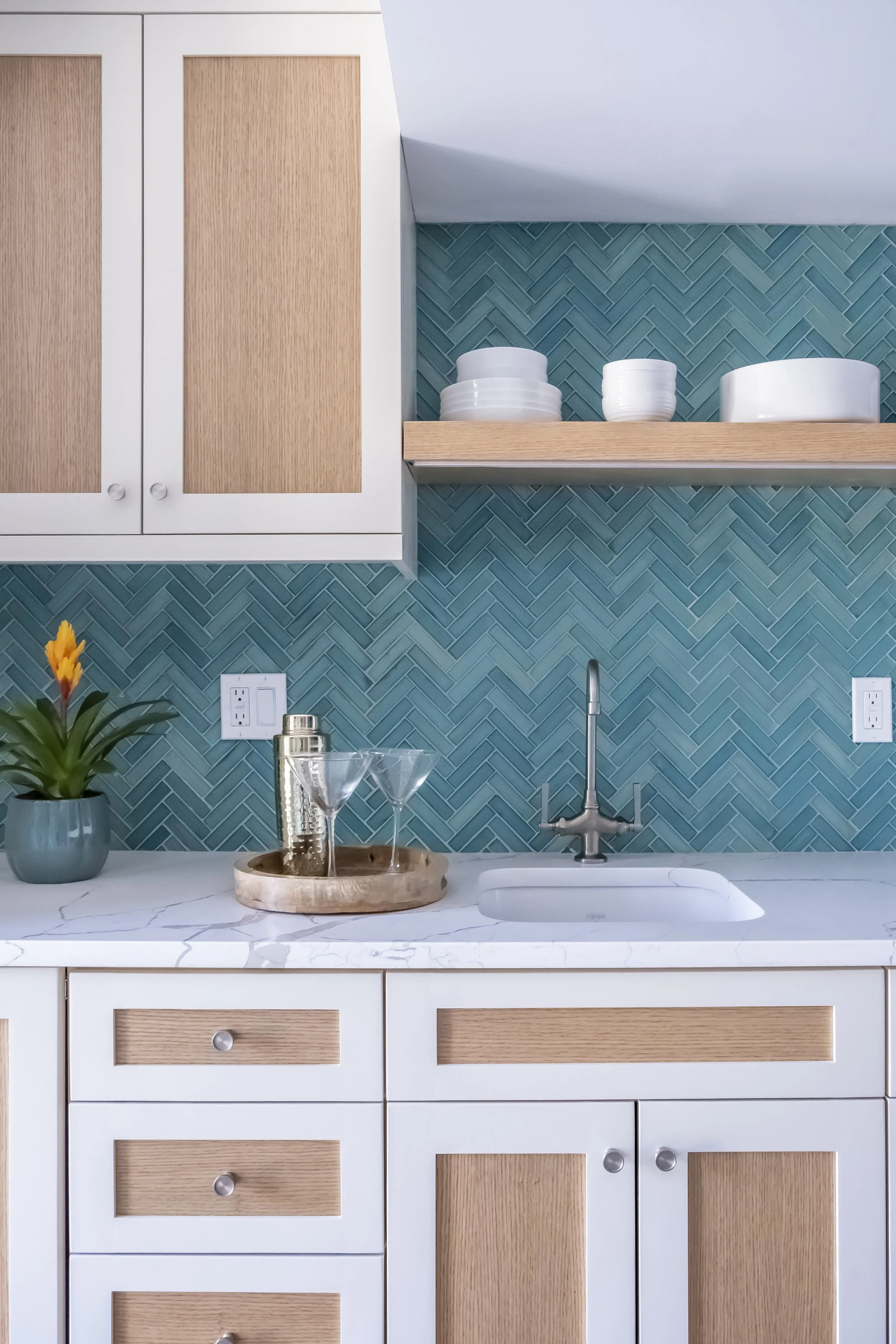 Kitchen with white and wood cabinets, teal herringbone tile backsplash, open wooden shelves with white dishes, small faucet, marble countertop, potted plant, tray with cocktail utensils, two martini glasses near the sink. View fullsize